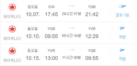극한의 환승 일정 우리는 환승해야 하기 때문에 시간대가 괜찮은 에어캐나다를 선택하게 되었다.밴쿠버 - 퀘벡 환승 시 2시간 30분정도 여유가 있는데 문제는 요즘 비행기 지연이 잦다는 거다..괜찮겠지?