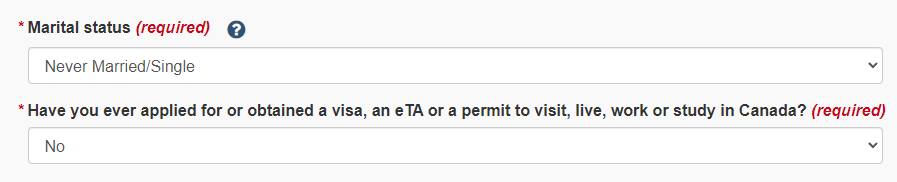 결혼 여부 / 이전에 캐나다 비자 신청한 적이 있는지?